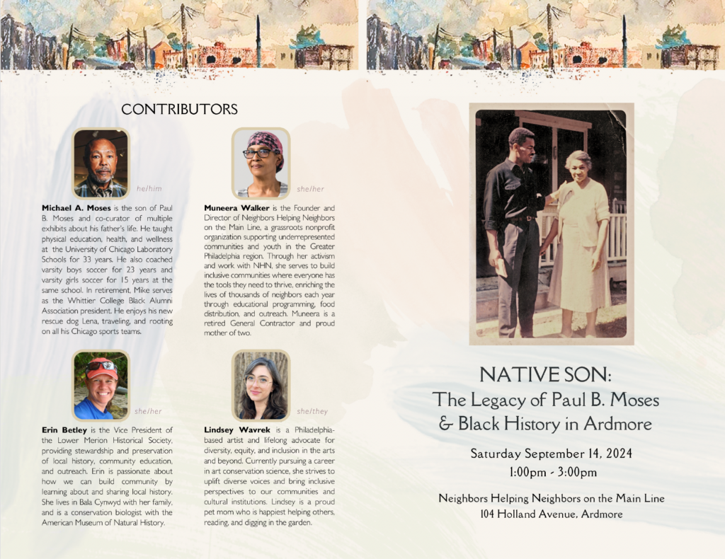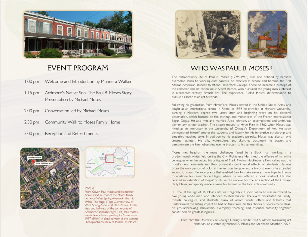 A year later, the next home for the exhibit was Haverford College. A smaller instillation called “Education and Empowerment” at The Barnes Foundation began that summer and showcased scholars in different fields which Dr. Barnes personally helped financially to pursue their studies. My father grew up in Ardmore, PA and it was suggested by Sarah Horowitz, Special Collections and Curator at Haverford College, that I speak with the Lower Merion Historical Society. She felt they would be interested in my father’s story. After a conversation with Erin Betley, Vice President of the Lower Merion Historical Society, we concluded that some sort of presentation would be of interest to the community. The presentation was hosted by Neighbors Helping Neighbors on the Main Line. Founder and Director Muneera Walker spearheads this grassroots nonprofit organization. The presentation took place in September 2024 and was called, “Native Son: The Legacy of Paul B. Moses & Black History in Ardmore”. The program had audio and video assistance from Lindsey Wavrek who is a lifelong advocate for diversity, equity, and inclusion in the arts and beyond in the Philadelphia area. She is currently pursuing a career in art conservation at Winterthur Museum Garden and Library in Winterthur, Delaware.